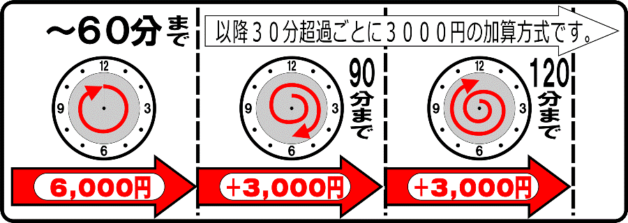 上図の通りの出張料金設定です。最初の60分は6,000円で、あとは30分増えるごとに3,000円の追加制度です。